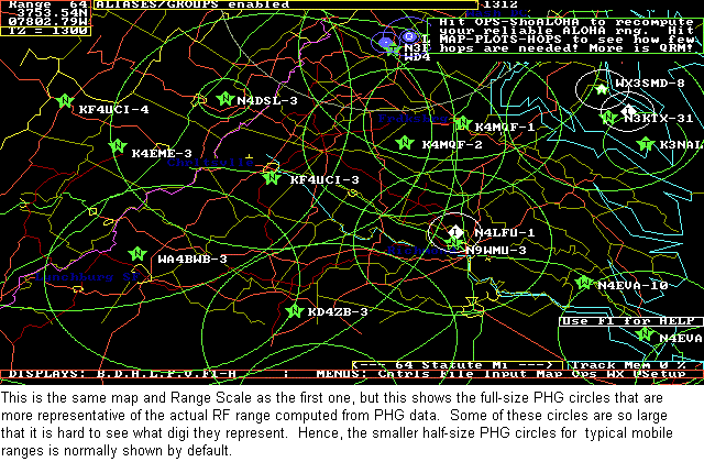 PHG CIRCLES ARE HAM RADIO: To me, playing around with the maps and PHG data from everyone is most of what APRS on RF is all about. It gives you a window on the RF environment and a way to visualize who can see whom and what kind of station they have. Even the Kenwoods display PHG data. Some purists rightly claim that these circles are not perfect and cannot possibly represent the actual range of each station, but that was never their intent. Their intent was to be a relative indication of the approximate range of a station so that hill-top stations would cleary stand out over low stations with marginal antennas. Combined with the offset feature to allow for directivity or for obstructions and local terrain, the PHG feature of APRS can be made to quite realistically represent the usable range of most stations. PHG data is a fundamental part of the APRS protocol and should be included in all fixed station packets and displayed in all programs.