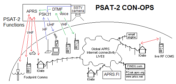 The unique features of PSAT-2 shown in the CONOPS image diagram below, are the APRS transponder and the PSK31 transponder (both of which flew on PSAT-1 and the new APRStt (TouchTone) /Voice transponder (which was prototyped on QIKCOM-2 which lets everyone do APRS using any radio with DTMF keypad, not just those with APRS radios. There have been several iterations of the APRStt system in APRS over the years since 2001, but this application will be new in space and will help introduce everyone to this unique alternate APRS capability.