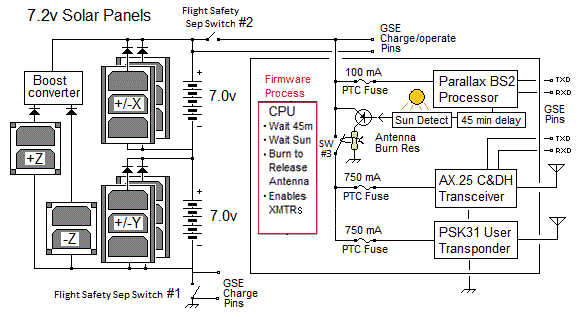Unique Power System: Unlike the standard Silicon cells on PSAT-1, PSAT-2 uses the very expensive UTJ multi-junction cells that cost 100 times more. But for the cost, these will deliver twice the power. With three UTJ cells per side, the peak solar voltage is 7.2 volts which is a perfect match to our 5 cell NiCd battery. Since only 2 cells fit on the top and bottom, those panels use a DC/DC boost regulator to get to the 7.2 volts. The power per panel is about 3.5 Watts, but with the rectaqngular spacecraft averages about 4 Watts in the sun. Reducing for eclipses provides about 2 Watts orbit average power.
