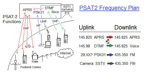 OVERVIEW: . PSAT-2 is a student senior engineering project built by a group of students at the Naval Academy for self training in smallsat technology. It is scheduled to fly on an STP-2 launch opportunity with a life span of several years. It continues the PCsat(2001) and PSAT-1(2015) missions noted above containing an APRS packet radio communications transponder for relaying remote telemetry, sensor and user data from remote users and amateur radio environmental experiments or other data sources back to Amateur Radio experimenters via a global network of internet linked volunteer ground stations. The APRS transponder also includes telemetry, and some command and control for the user modes. PSAT-2 also adds a unique experimental DTMF uplink on 145.98 MHz for users in the field who might not have access to an APRS radio.