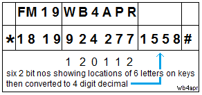DTMF Callsign Encoding: PSAT-2 (like QIKCOM-2) also cleverly compresses a 6 character call into only 10 digits following the 4 digit grid noted above. The first six digits of the call are the matching single keys for the callsign letters, EG: 924227. The next 4 digits encode the 2 bit location of each of the 6 call letters on each of the 6 keys used. For example, the 6 letters of WB4APR on the 6 keys are key locations 120112. Since each location is between 0 and 3, they can be encoded in 2 bits each (powers of 4) and assembled left to right into a 12 bit binary number. To convert to decimal, take the first 2 bits times 1024, the next 2 bits times 256, the next 2 bits times 64, the next times 16, the next times 4 and the last 2 bits times 1. Then add them up and get the 4 digit decimal "key code" (1558 in this example). This 4 digit decimal number we call your callsign key code. For those that are 12-bit-challenged, Bob Wood WA7MXZ has written an
