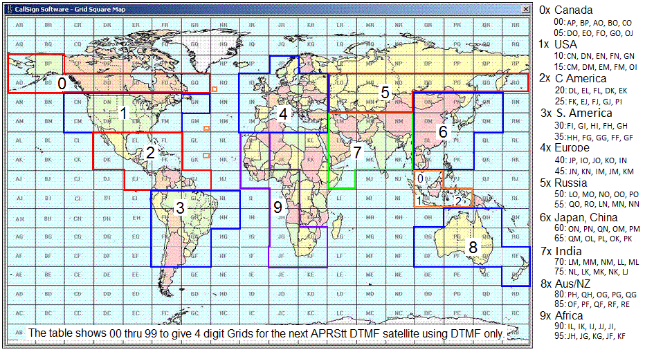 APRStt GRID MAP Encoding: The map table below encodes the 99 grids that have 99.99% of the worlds ham population into only 4 digits by converting the first two letters into two digits from the 00-99 table. You can see that our Maryland FM19 grid becomes 1819 in DTMF.