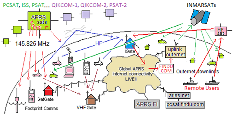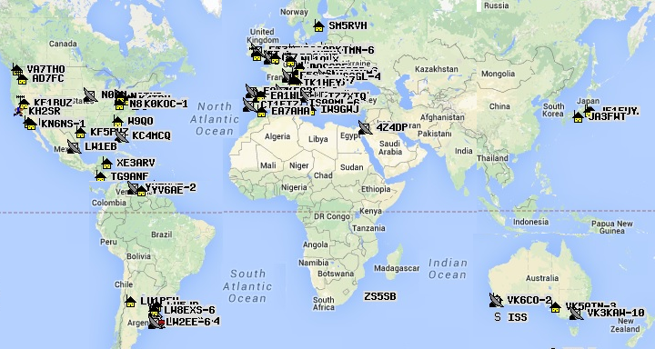 APRS Packet Transponder: The APRS packet transponder is an AX.25 Packet Radio Relay similar to what is flying on PCsat and the ISS. This ongoing mission in space on the original PCsat is now over 12 years old and pioneered this very popular operating mode via the ISS since 2006. Both of these missions deliver packets to users worldwide via the global network of volunteer ground stations feeding the two downlink capture pages: psat.aprs.org and ariss.net. These pages display live maps such as the one below, of the most recent user position data and capture all message traffic between users. See the APRS link budgets. In addition there is also a PSK31 transponder as noted below.