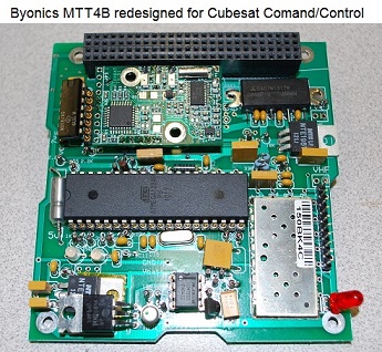 Low Cost Comms Board: Another feature of this cubesat is our development of a standardized cubesat communications card (shown below right) based on the popular Byonics MTT4B all-in-one APRS Tiny-Track4 module. We are standardizing the MTT4B onto a standard cubesat-104 board (and adding a 9600 baud UHF downlink if needed) to allow other schools to rapidly develop their own amateur radio cubesat projects. We call this board the SATT4.