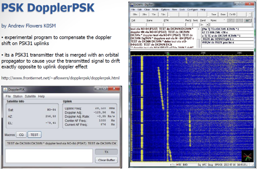 You cannot use normal Doppler Radio Tuning on PSK31: Any attempt to correct for Doppler by tuning the radio (as is standard practice for other satellites) will not work with PSK31. When the radio steps in frequency, no matter how small, a phase discontinuity results and that corrupts PSK31. So make no attempt to correct the uplink SSB signal with radio tuning. It is OK to let the software adjust the FM UHF downlink the usual 5 KHz steps since it is only 4 times during the pass. But not the SSB uplink.