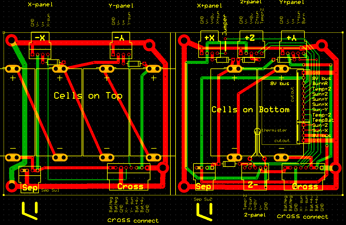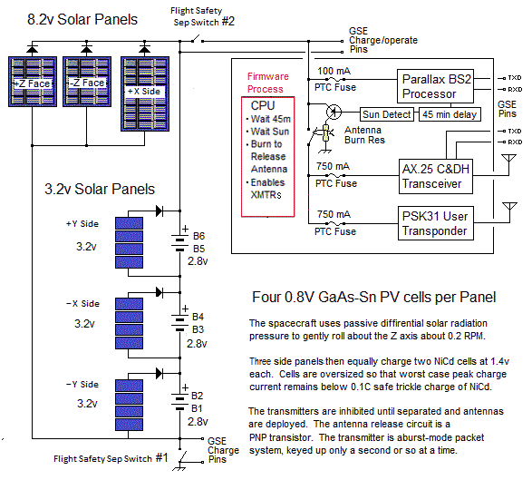 Unique Power System: This model with the 4 large and efficient solar cells per side is designed around a unique power system. Since the total solar voltage per side is only 3.2 volts (0.8 volts per multijunction cell) we cannot charge the complete 9.6v battery string, but can charge two NiCd cells per solar panel. These 4 side-panel/NiCd-pairs are operated in series for the 9.6v bus, but are charged in parallel. This parallel charging of no more than two NiCd's in series per solar panel reduces one of the primary problems with spacecraft battery charging systems and that is the uneven charge balance that accumulated when entire strings are charged in series.