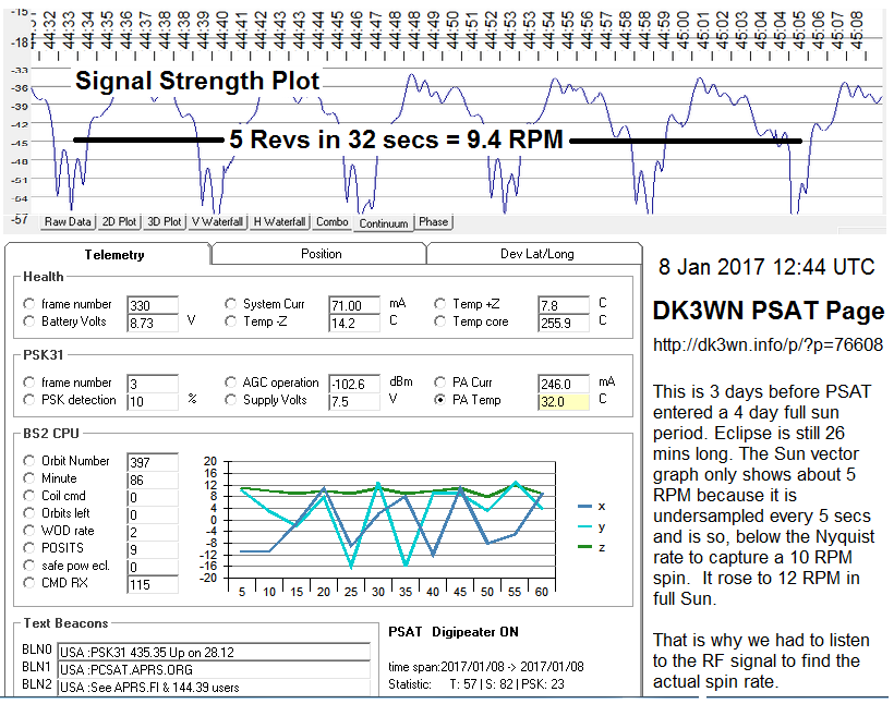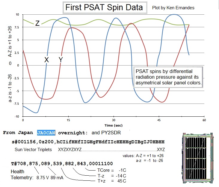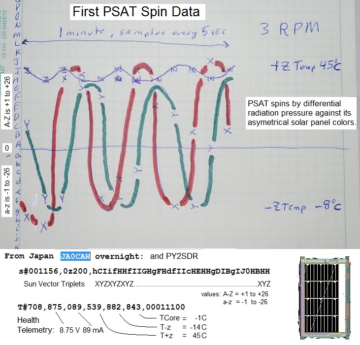 First SPIN data: Initially, PSAT appeared to be spinning about the Z axis as designed. On the 3rd day (first spin data) the spin about the Z axis was about 3.0 RPM with little wobble and the +Z axis pointed about 45 degrees off the Sun. This gives max power as all three axes are always illuminated. You can see how we manually decode the S#OOOMM... status packet alphabet soup to plot the 1 minute spin samples in the photo above. Or you can see how Ken Ernandes later plotted it. By the end of the sun side of the orbit, the +Z panel is reaching +60C (140F). By the 10th day, though, the spin was down to 0.62 RPM. And was down around 0.2 RPM for almost 25 days, then at the time it enetered a 10 day period of full Sun, it has been up between 3 and 6 RPM ever since (actually as high as 15 RPM).