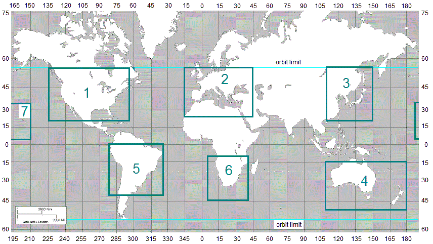 Continetnal Bulletins: Since the above scheme allows PSAT to know where it is, then it can use that information to customize its bulletins to match the continent that it is over at the time. We have programmed PSAT to send unique bulletins over the LAT/LONG continental boxes shown here. There are three possible beacons for each continent. They are alternated every minute.