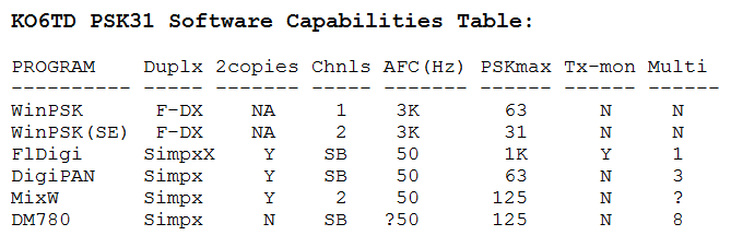 A modest antenna can copy the FM waterfall downlink horizon to horizon and permits dozens of simultaneous PSK31 users to operate full duplex and maintain a continuous group dialogue throughout the pass. But operating full duplex on PSK-31 is new and it will take a while for users to figure out how to do this. KO6TD has prepared the table at right of capabiites of typical PSK31 user software. Only WinPSK can operate full duplex but a special PSAT PSK31 uplink has been written so you can use any other program too.