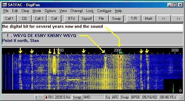 Operating PSAT PSK31 Properly - And full Duplex: Andy, K0SM wrote a PSK31 TX-only program that not only corrects for Doppler only at the Audio level, but it also lets your run full duplex with your existing PSK31 downlink. It pre-corrects the audio for Doppler on the uplink as shown below so that your signal remains constant in the downlink! You can see his uplink coming down as a straight track while others are showing Doppler. Most PSK31 clients can compensate for up to 1 Hz/sec of Doppler, but Andy's program makes your signal constant. Other users without compensation, can drift from 1 to 6 Hz per second depending on where they are relative to the track of the satellite.