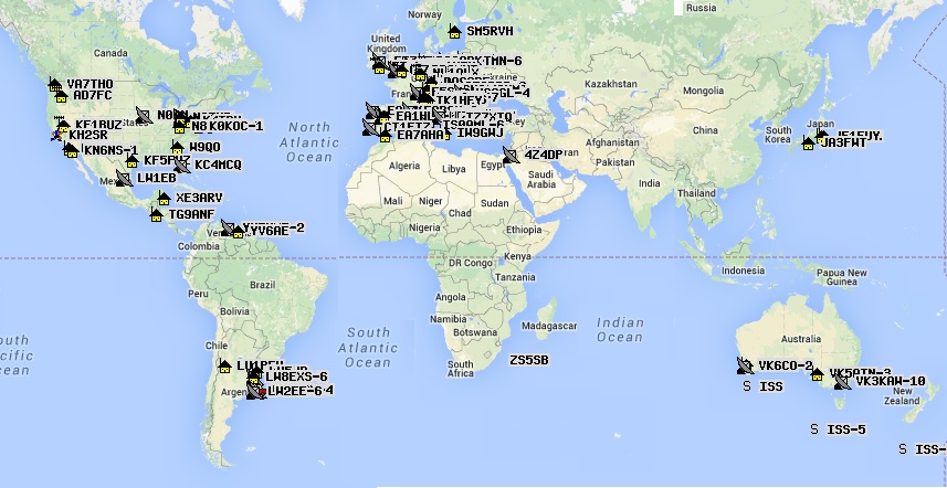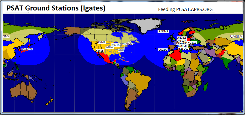 The map above shows the ground stations that have IGated PSAT packets to the APRS-IS (internet system). Although these are the same stations listening to 145.825 as the ISS, the ISS station is 14 dB stronger (10W versus 0.35W for PSAT). So only IGates with good weak signal performace are successful with PSAT. As you can see, we need IGates in Hawaii, India, China and the Southern Hemisphere.