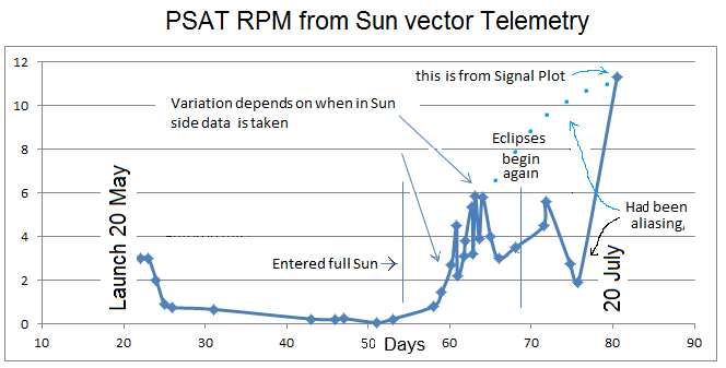 while eclipses were at 26 minutes showing about 9.4 RPM, but by 14 Jan it was noted by KO6TZ to have spun up to 11.7 RPM and got as high as 15 RPM in full sun.
