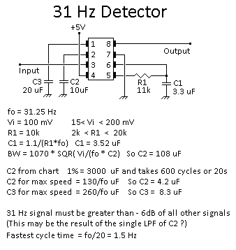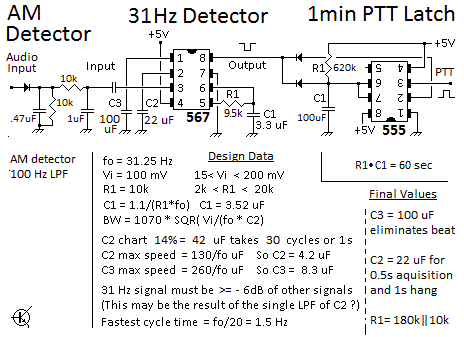 WB4APR comments that the 567 PLL tone decoder could find enough coherent 31.25 Hz energy fading in-and-out to keep retriggering a 555 1 minute timer on the TX line. Turns out if we try to limit the capture bandwidth to only 1% it might take 20 seconds to capture a 31 Hz signal. (see the slow design). So, looking at the above detections by KA3WCA, it is probably better to plan on wider bandwidth (14%) and quicker detections to keep retriggering the 555 hang timer. Besides, if we hear anything, we probably want the transponder to come up. So the design shown below uses the a "faster" design and so its trigger time is about 1 second and maximum cycle time is 1.5 seconds. As a note, the non 31 Hz energy must be no more than 6dB more than the 31Hz energy so we low pass filter it before the 567 wioth two RC stages.