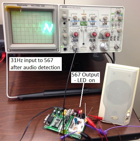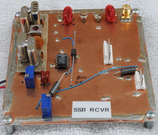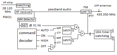The picture shows the detection of the 31 Hz when reasonablly strong PSK31 signals are in the passband. With this test, there is no audio gain beyond what comes from the headphone jack on the front of my HF radio, so veryvweak signals are not yet picked up. The LPF input filter stages are not yet optimized. Since all uplink users will be 100% transmit duty cycle during the pass, I shortened the PTT hang timer to 30 seconds. This gives plenty of time for 31 Hz detection to retrigger the timer. The 567 and 555 will be lead shielded on the chip to reduce radiation issues.