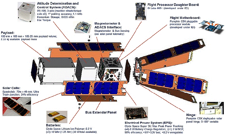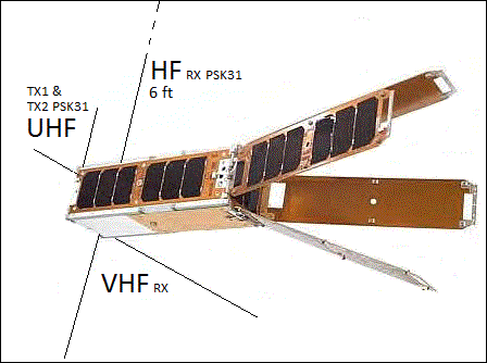 3U CUBESAT BUS:The next image below shows an exploded view of the 3U cubesat similar to the one that is offering us a ride. A google search turned up this European Space Agency web page that describers the bus. This PSK31 team has little control over the cubesat nor little access to the complexities of the spaceframe so we want this payload to be as autonomyous as possible. The spacecraft will be in a low enough orbit that it will probably fly in a lawn-dart attitude except when we are experimenting with the attitude control system. We are only getting space for our Transponder board and we are doing the top plate of the 3U cubesat and all of the antennas shown in the top image above.