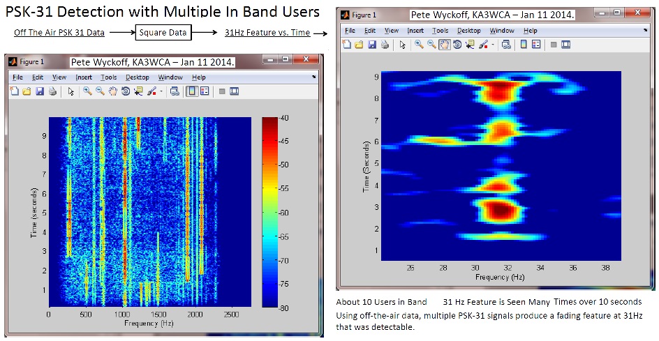 Auto Mode: This mode has to detect users in the passband to turn on the Transmitter and clearly save energy over the other 90% non-amateur areas of the globe. KA3WCA did a simple test with off the air signals shown above to see if he could detect the presence of energy at 31 Hz in the passband and found that if he squared the signals there was a very clear detection of 31 Hz energy fading in and out as signals combined in and out of phase. Peter Martinez, G3PLX the father of PSK-31 has these 31 Hz detection comments on detection and suggests a long hang time and +/- .25 Hz bandwidth.