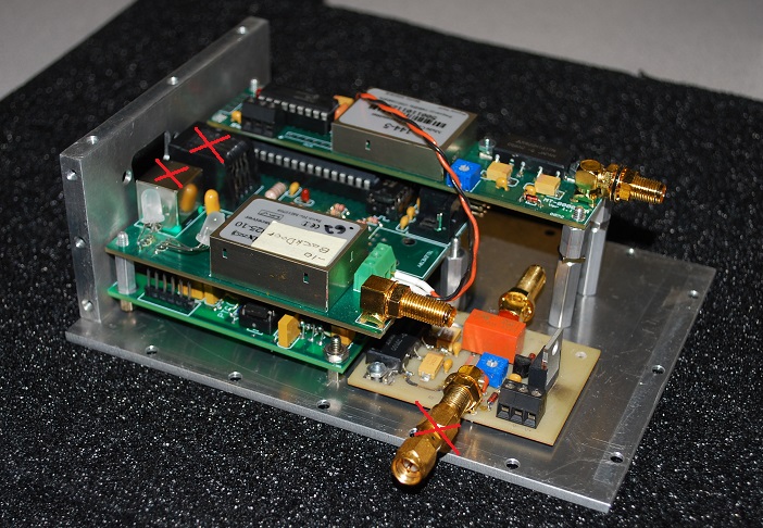 packet radio modules from Byonics.com as shown above. On the lower right is the main packet transponder module (the MT-TT4 all-in-one APRS packet system with internal RF transceiver). The MicroAmp-3 above it boosts that to 4 Watts. In the center vertically is the 4 Watt QSY Alert Beacon transmitter for use over North America. A European alert was also planned since the beacon did have an A & B frequency selection, but this was disabled due to coordination issues. The final board on the left is our designed combination power supply system and antenna release mechanism.