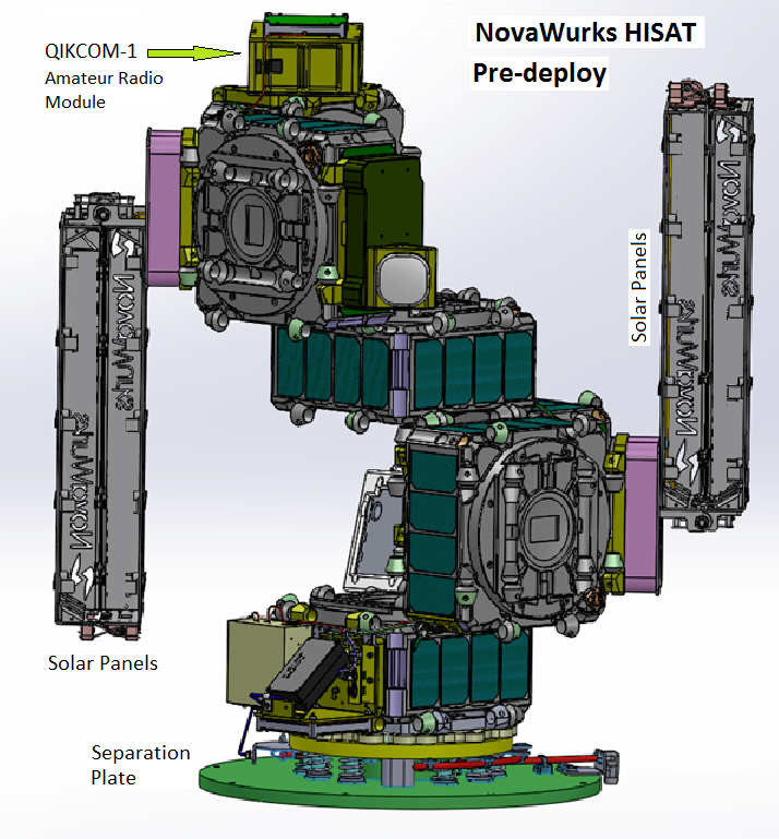 QIKCOM-1 Integrated on top of the SIMPL Satellite: The image above shows the complete SIMPL spacecraft with the QIKCOM-1 module on top. The large solar panels will have significant drag and are the reason for the relatively short few months or so life of the mission. Above right is a solid works view with the spacecraft still attached to its separation plate and before the solar panels are deployed.