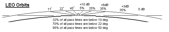 The drawing below shows the Earth and the typical LEO orbit to scale. It is clearly seen, that satellites are rarely “overhead” and spend most of their in-view times well below 30 degrees. Another revealing observation is that when satellites are higher in elevation, they are also 6 to 10 dB closer. This means that for operating LEO satellites, you need maximum gain on the horizon and can get by with minimial gain at high elevations. Angles are shown on the left and percents and path loss are shown on the right.