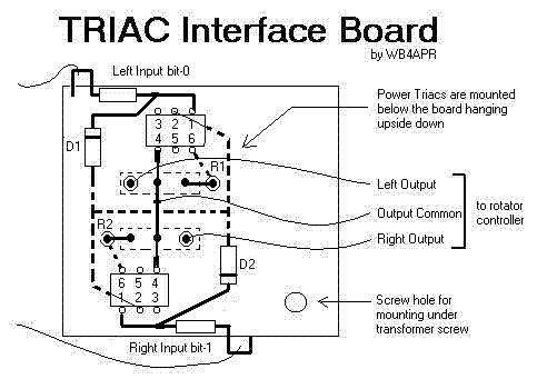 6) BUILD TRIAC BOARD according to the sketch and mount under the upper right screw that holds the transformer in place. Solder two short jumpers from the Triac outputs down to the screw terminals #1 and #2 going to the external rotator. Left or right, 1 or 2 doesn’t matter. The circuit is symetrical.)