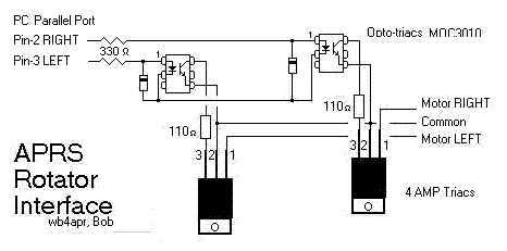 3) Adding the TRIAC's and optoisolators to interface the PC to the ARCHEROTOR wiring. This circuit uses a special balanced optoisolator design so that there is no chance that the bits on the parallel port can cause both TRIAC's to switch on at the same time. The rotator goes left or right depending on the polarity of the logic level applied to the two wires.