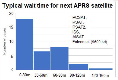 Your Next Pass: KE6BLR has also written a pass predictor for the next APRS satellites for your location! This data shows that with the 6 active APRS satellites on orbit, generally half the time, you are no more than 30 minutes from the next pass, 75% of the time you are less than 60 minutes to the next pass and 93% of the time your next pass is within 90 minutes as shown at right.