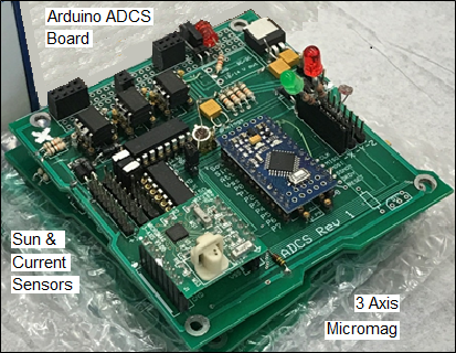 ADCS Board: The ADCS board is laid out to hold either an Arduino mini-pro processor or a Parallax Basic Stamp CPU. The board also contains six current sensors for the six solar panels and 6 channels for photo-resistor sun sensors. It also contains a 3 axis Micromag-3 magnetometer. All of the solar panels plug into header pins on this board which is usually the top board in the stack.