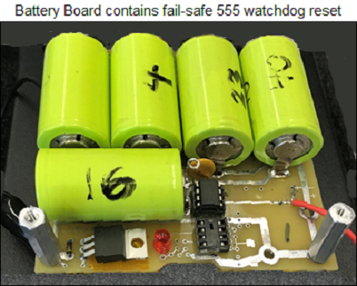 Battery Board: To avoid the safety issues and critical charging and discharging requirements for modern LiPo batteries which require individual Baterry Management Systems (BMS) on each LiPo cell, we use NiCd batteries. These have 60 years of space heritage, require no BMS, and can be over dischaged and overcharged by more than 10% indefinitely with no ill effects. We use the large 1800 mAh cells because they can absorb any overcharge that might occur from a cubesat size solar panel giving us a completely safe passive charging design while also providing 12 Whrs of energy storage operating at a bus voltage between 6-7 volts. Further, there is a current sensor for battery current and a 555 watchdog timer that must receive a repetiting heartbeat from the spacecraft CPU or it will time out after 90 seconds and reboot the power to all systems on the 5v bus.