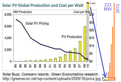 The 2010 chart above shows the 12:1 drop in panel prices over the last decades and 3:1 drop in just the last few years. Solar panels are now less than 75 cents a watt!. The world exponential growth in production of solar PV panels now is so high, you have to scale down the chart by 25-to-1 just to fit the 2015 global production as shown on the above right!
