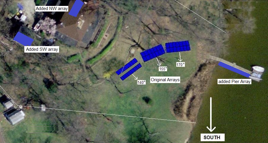 Temporary Array: The 8kW of panels shown above were just propped up in the backyard on 2x4's because of my years long struggle to get county and state approvals to put some of them on a pier in the creek. They are now semi-permanently mounted in the same location becuase, now, 4 years later the state has finally dropped its prohibition to solar on piers but my system is working fine where it is. Pictures below show my 3 inverters and basement wiring.
