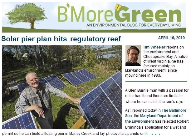 Partly due to my efforts and presentation to the MDE (Jan 2012), Solar Panels are now ALLOWED ON PIERS and in the critical buffer area in Maryland as a result of nearly 4 years of trying to get my 8kW solar array working on the shores of Chesapeake Bay waters. (As an aside, in the process, a few of us DIY guys have formed a group of other like minded solar power experimenters called SolarDIY)