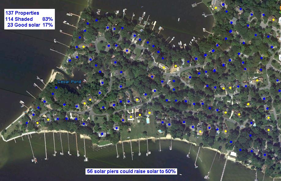 Why Solar Panels on Piers? because Piers are almost always in full sun and the homes that have piers are also usually those with the means to invest in solar without any second thoughts. The real truth about solar is that despite our best intentions, here in Maryland typically 83% of homes are shaded and cannot produce meaningful power. We like shade to keep our air conditioning costs down. But this is counterproductive to solar. See the above aerial view of Severna Park. All the homes with good solar roofs are shown with a yellow dot and the 83% with shady roofs are shown with blue dots. (Remember, even partial shade drastically reduces solar potential. Even a 6" shadow completely knocks out every panel it hits). But there are 56 homes with piers that could install solar panels on them. These added 56 solar homes would nearly triple the percentage to an overall 50% solar.