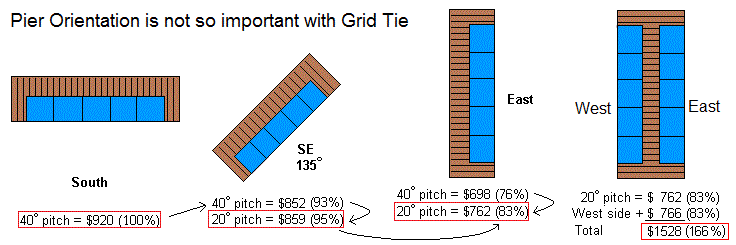 Pier Orientation: Surprisingly, pier orientation is not so important with grid tie because the only thing that matters is total annual production and since almost any angle in the summer will produce nearly double what an ideal south facing array produces in the winter, it almost makes up for it over the year total. As shown below, the ideal angle is south at 40 degrees here in Maryland. Using the gold-standard array performance predictor PV-watts, you can see that a 5.3 kW south pointing properly tilted array will produce about $920 annually.