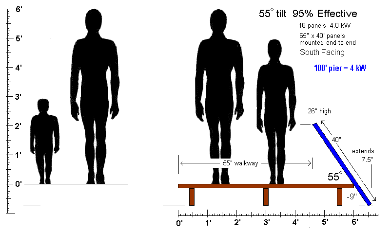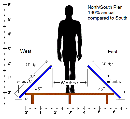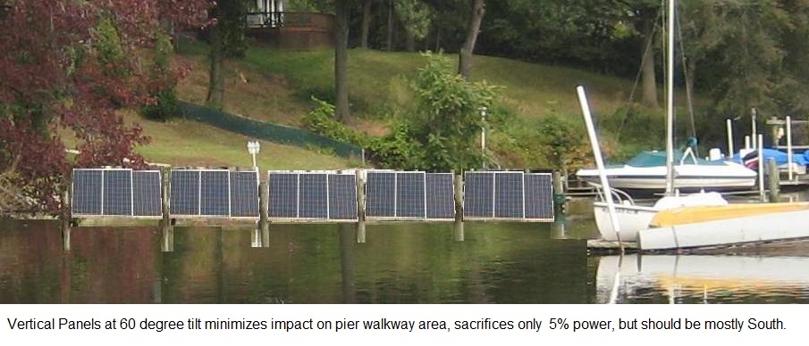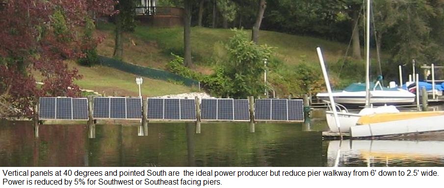 But when pointing 45 degrees to the Southeast (or Southwest) the power only drops by 7% to 93%. But some of this can be regained by lowering the tilt angle to 20 degrees losing only 5% from ideal. Going further to due East would drop to 76% unless the tilt angle is similarly reduced to give 83% of the ideal. But notice, if you can get 83% pointing East, then you can also get 83% pointing West! If you can fit both of them on the pier, then the North/South oriented pier can actually generate nearly 166% of what the ideal South facing pier can do because you have double the pier area!. The problem is the narrow walkway. But since the solar panels can act as hand rails (if you raise them slightly), the walk is not that bad.