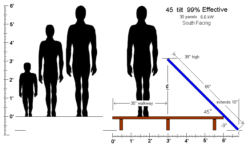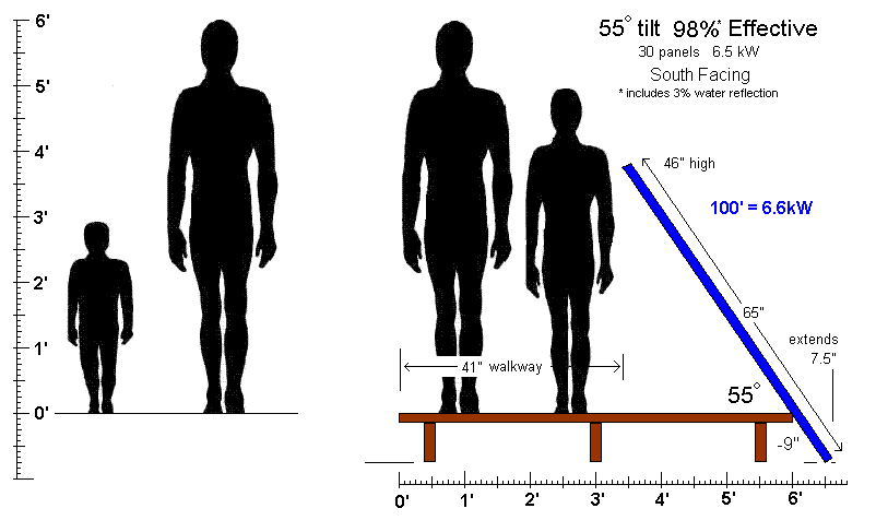 Pier Panel Design Alternatives: No one wants to see large obtrusive solar systems on piers, so the 4', 1', 1' restrictions were propsed to make sure that panels were not too high so even children can see over them and they dont substantially increase the water vegitation shading which is an issue for the bay. Within these restrictions, design decisions are based mostly on the orientation of your pier and on the value you place on the pier walking area versus solar production. There are two simple rules of thumb. First, better (lower) solar angles generally reduce the walking width of the pier. Second, the further from due south the alignment' the lower the tilt angle for best power production. The ideal array is South pointing with a tilt angle of 40 degrees. But with the 45 degree tilt angle shown above, you can obtain nearly maximum power production with only a modest reduction in walking-width. On many long piers, most of the length of the pier is only used for walking anyway, and so this is not a significant detractor. The example below shows the side view of this optimum, south facing design.