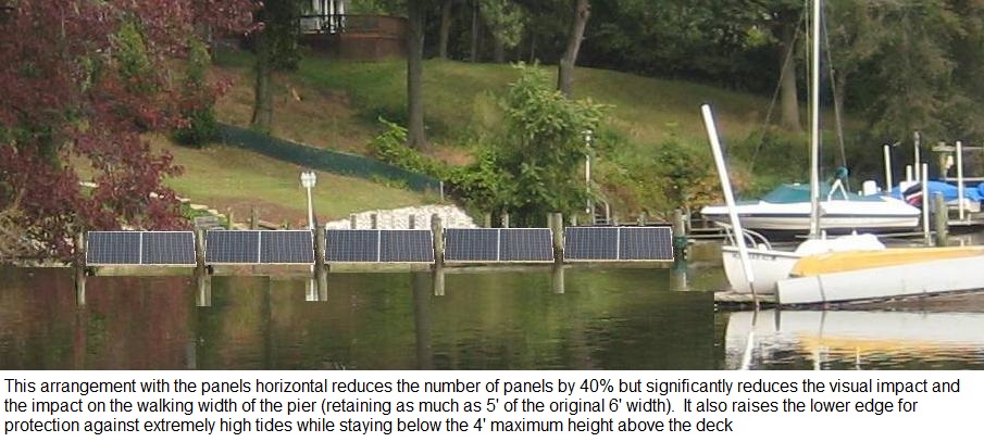 Maryland Bill HR 1266: Fortunately, in 2011, a bill was authored to make an exception for solar panels on piers. See HR 1266. This was presented to the Maryland House Committee on the Environment on March 2011. Only the Maryland Department of the Environment, the County Zoning representative and the delegate from Severna Park were opposed. It was killed in committee. Eventually I was able to brief an MDE committee (see presentation) considering this issue on 19 January 2012. Blame me for the 4', 1' and 1' restrictions noted above that I suggested in that presentation. Subsequently, and with no fanfair, in July 2013, MDE eliminated their prohibition though I did not find out about it until March 2014!