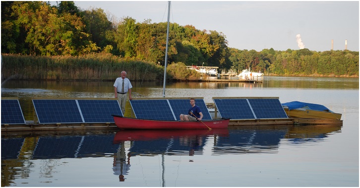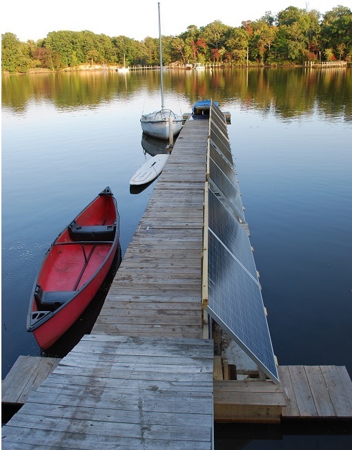History: Solar Piers Blocked by MDE! The Maryland Department of the Environment had denied applications in the past for solar panels on a pier, "because solar panels have nothing to do with the water", IE, they are not water dependent. The MDE considered the only approvable use of a pier on the Chesapeake Bay to be for access to a gas burning, oil-leaking, energy consuming, noise generating, bay-polluting, air-fouling fossil fuel stink-pot boat. That's OK. But putting solar panels on a pier to power a non-polluting, clean energy electric boat and routing the surplus back into the grid and provide the same improvement to the environment as 300 trees, was not! Solar panels do not depend on water but actually improve water quality as noted below.