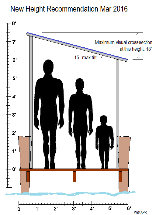 12 March 2016 Update: It turns out my recommendations to the MDE (that were adopted) to limit the height of solar panels to no more than 4 feet above the deck (such as in my photo above) only makes sense on a floating pier. It would be disasterous on a fixed pier where hurricane-like flooding (Isabell) might rise over 5 feet above the pier deck in the Severn River. So as of this date, I have asked MDE to reconsider this height limit while retaining the limit on visual cross section. For example a nearly flat solar awning could be 7 feet high but when tilted at the Manufacturers minimum tilt angle (15 degrees) would still be a very low visual cross section of less than 18 inches as suggested in the drawing at right.