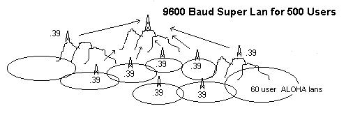 In fact, you will notice that the combined effect of just going cross band, eliminating one hop, and amortizing TXD's can multiply the size of an ALOHA LAN by a great amount over the maximum possible 60 station typical multi-hop ALOHA (remember, the 60 user ALOHA can only be achieved with all stations direct and all hearing each other, so a real 1200 baud system actually performs at much less than 60). We can gain so much capacity by reducing hop count that the hard part will be how to find that many users on RF to be able to combine. Changing some of the RF receivers to links to distant other areas and Super-Sites could even be supported.