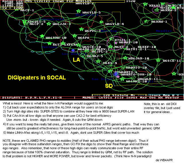 LOW-TIER DIGIS: Notice that no coordination or cooperation of the low-tier digis is needed. However, to live up to the full potential of APRS in this area, the New n-N Paradigm must be implemented first or this is a waste of time. This is necessary whether or not this super-site is ever built, because reducing the QRM and getting everyone to drop back and operate only within their local ALOHA range is the only way to assure end user reliability. See the New n-N Paradigm details.