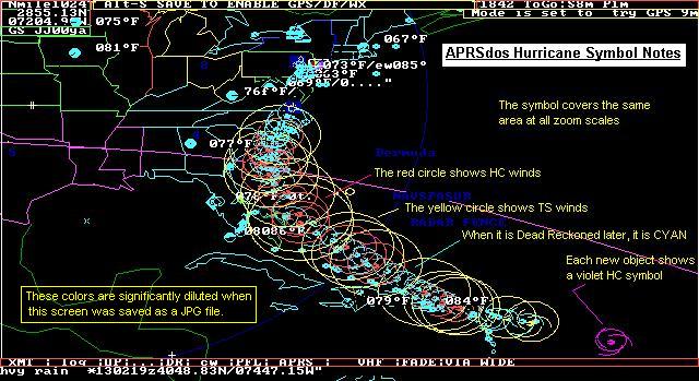 The Hurricane symbol covers hundreds of square miles and it expands or contracts at all range-scales (zooms). The twister symbol is shown at the lat/long of the reproted hurricane, but then a red circle is shown at a radius of the reported Hurricane force winds and a yellow circle shows the area covered by tropical storm winds. Further, these circles are offset by the vector sum of the wind speeds and the speed of movement of the storm so that the danger quadrant is bigger than the leward quadrant. As you can see, no one can miss the presence of the Hurricane, nor the area impacted by its winds. Several other symbols in APRSdos vary with map range scale so that the area covered is constant, such as Grid Squares, DX spots, and maybe others. I wish I had had coding room so that Thuderstorms and most other weather objects did the same...