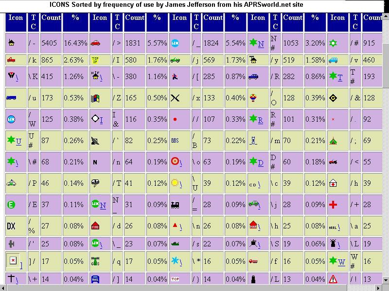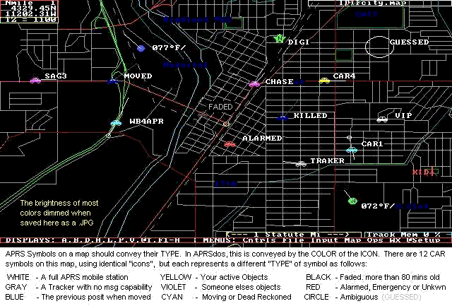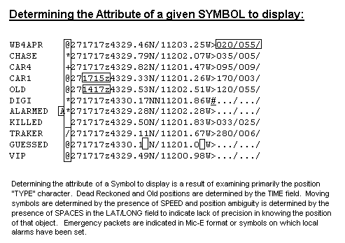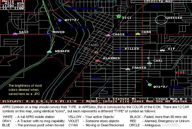 APRS SYMBOL ATTRIBUTES: One of the most important aspects of APRS is the display of tactical information on maps using symbols for each station. Each such SYMBOL has several ATTRIBUTES that convey additional meanings. In the original APRS, these additional attributes were displayed with COLORS and circles. Some new software has taken a more simplistic approach and simply usees fixed color ICONS but without any displayed attributes. Thus, the users of these systems are blind to attribute information on their maps without having to click on each one... This operator intensive masking of important information does not do justice in some cases to the original intent of APRS information display to the end users.