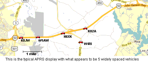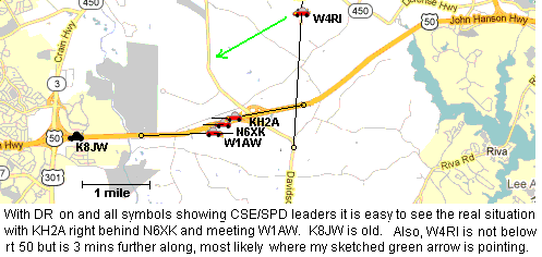 Notice how CAR1 and WB4APR have been deadreckoned since more than a minute has passed since their last positions came in. Therefore their last known position is marked with what I call their "anchor circle" and then the Symbol has been moved to where they could be now based on their last known course and speed.